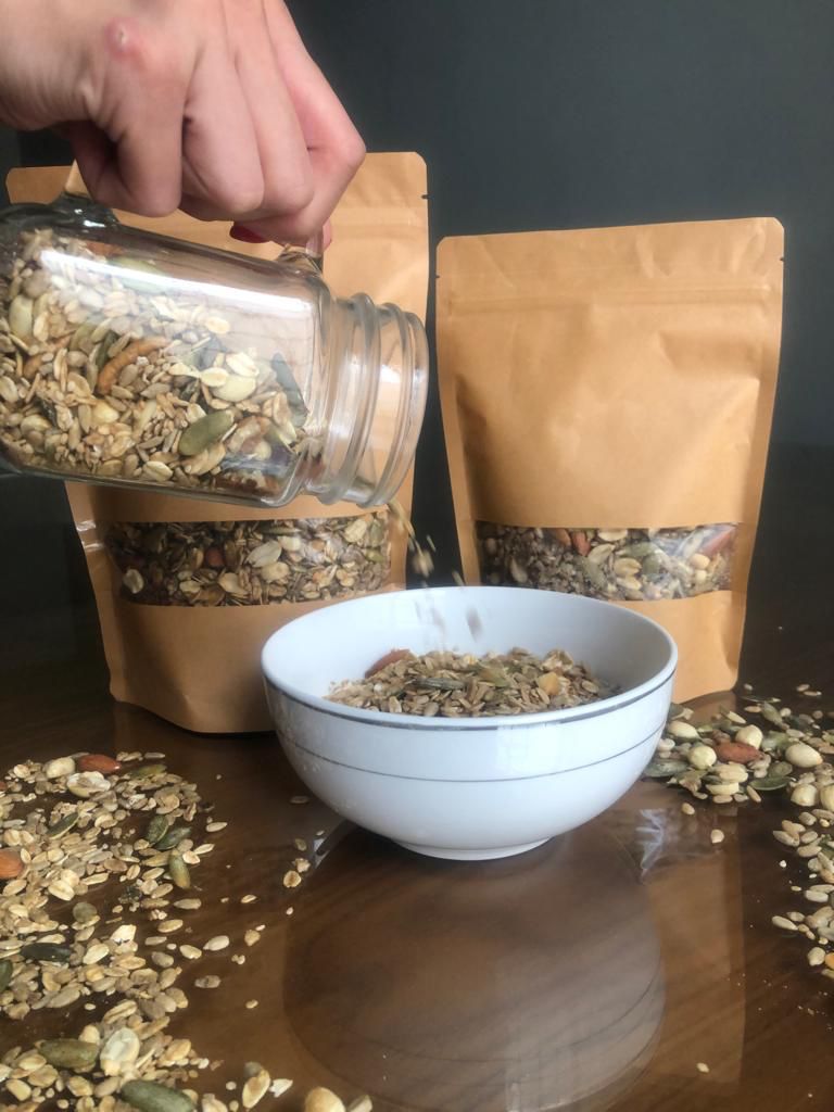 Granola artesanal y saludable, libre de: azúcar, aceites, aditivos y conservadores.